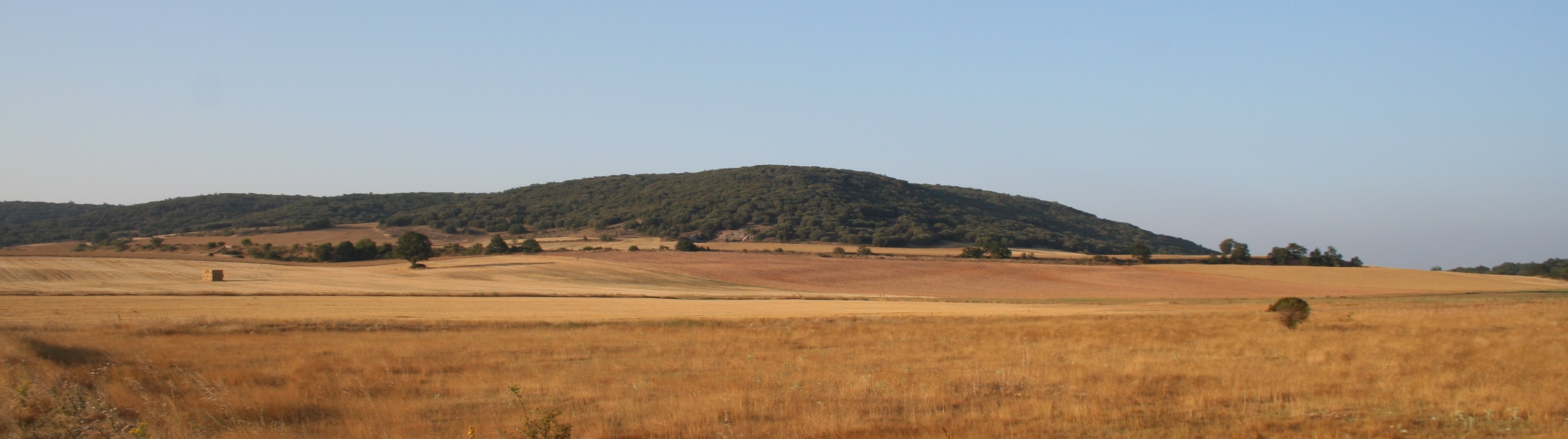 Vue panoramique des montagnes Atapuerca (Sierra de Atapuerca), emplacement du site archéologique d'Atapuerca, un site patrimoine mondial de l'UNESCO contenant plusieurs grottes, où des fossiles et des outils de pierre des premiers êtres humains en Europe, appartenant à l'espèce Homo heidelbergensis, ont été trouvés