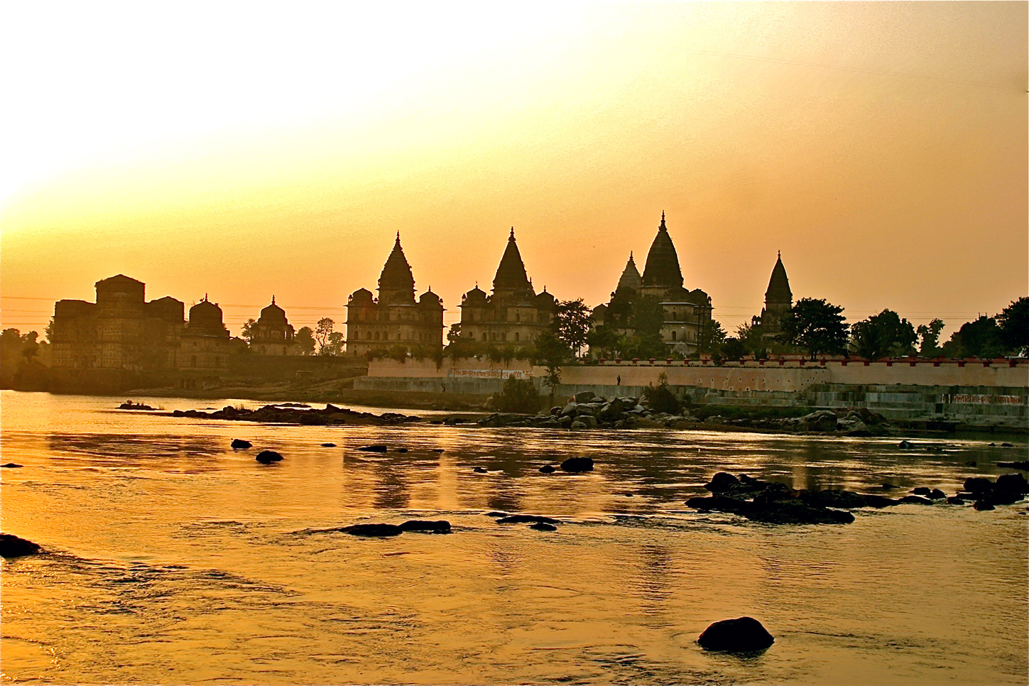 Chhatri le long de la rivière Betwa et coucher de soleil sur les palais sacrés d'Orchha, ville du Madhya Pradesh en Inde