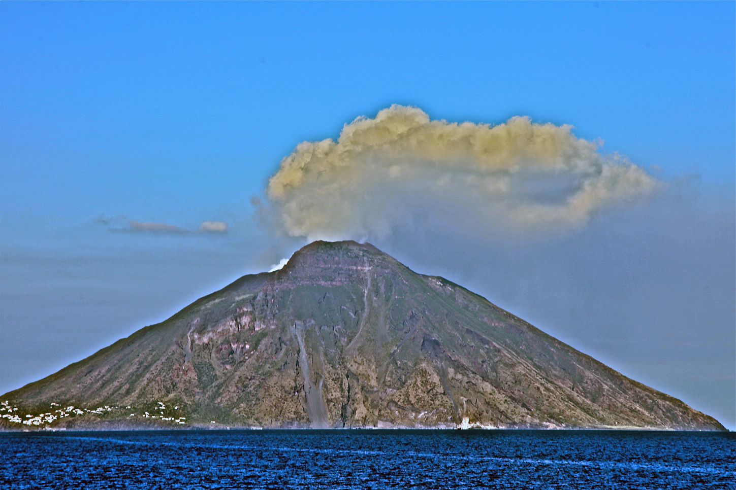 L'île de Stromboli vue depuis la mer Tyrrhénienne, îles Éoliennes (Isole Eolie en italien), au large de la côte nord de la Sicile, en Italie
