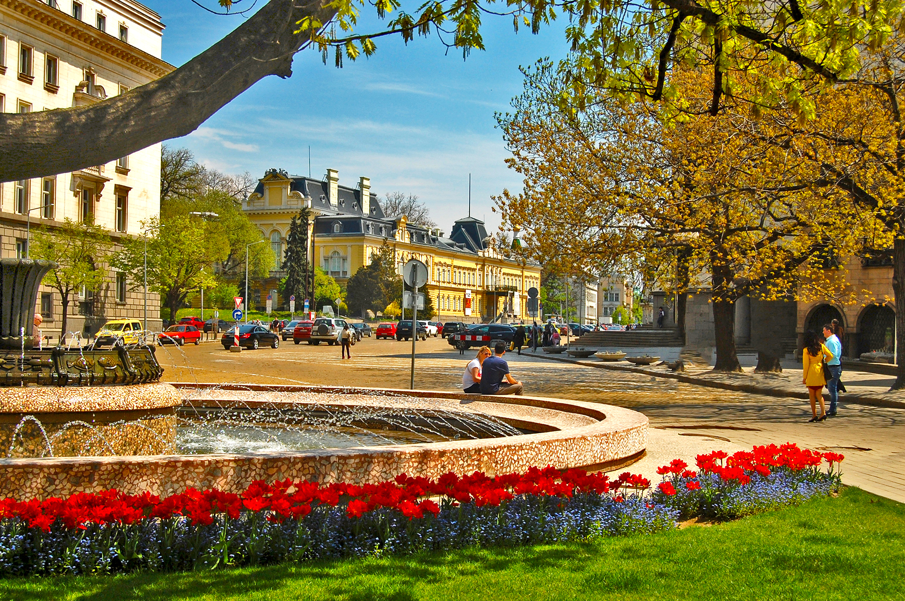 Espace vert, fontaine et fleurs, à Sofia, sous un ciel bleu - Sofia, Bulgarie